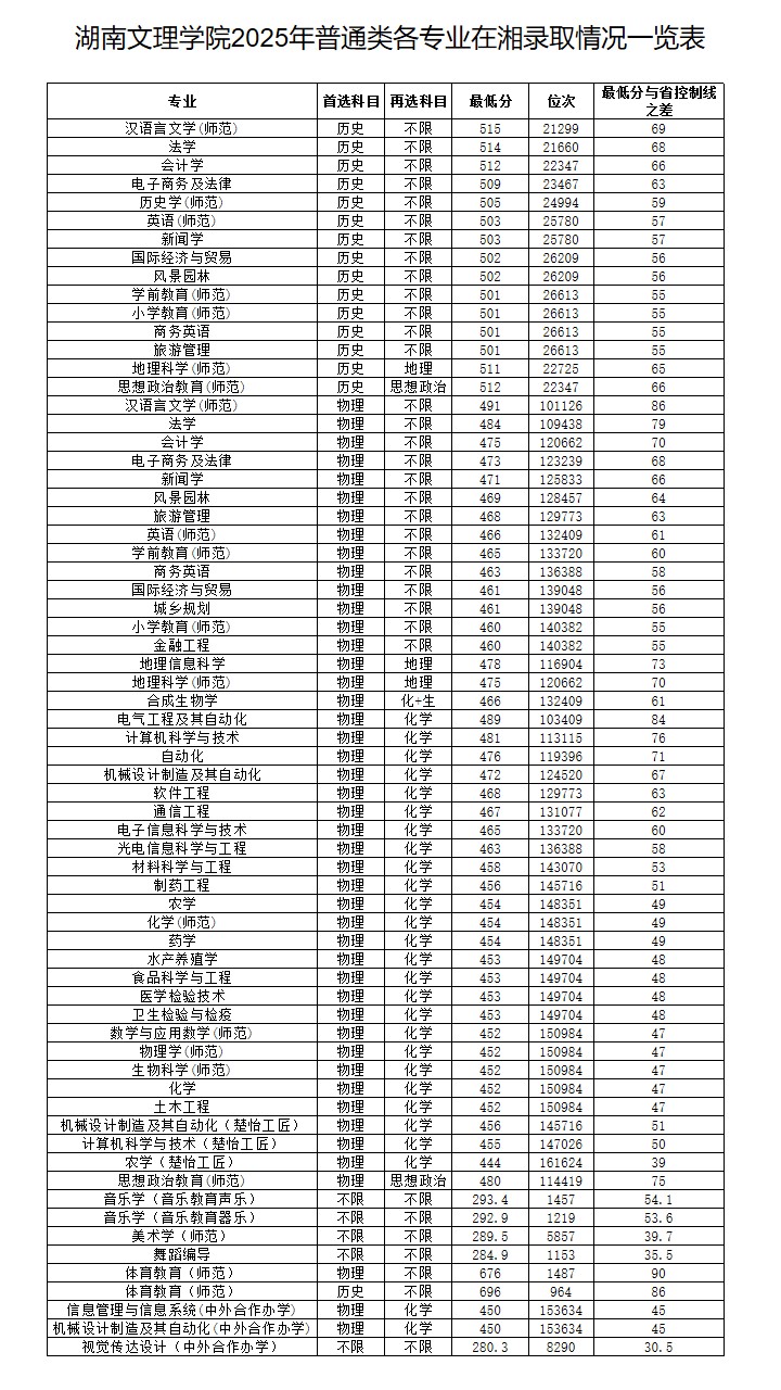 湖南文理学院2025年普通类各专业在湘录取情况一览表