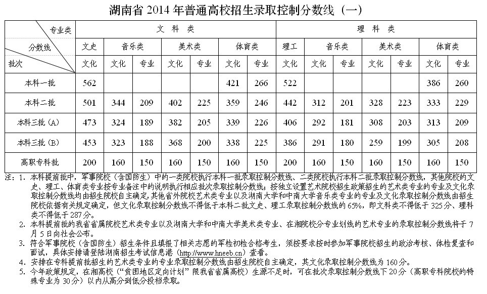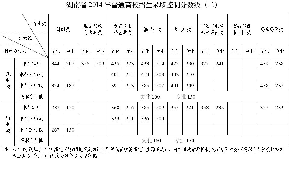 湖南省2014年普通高校职高对口招生录取控制分数线